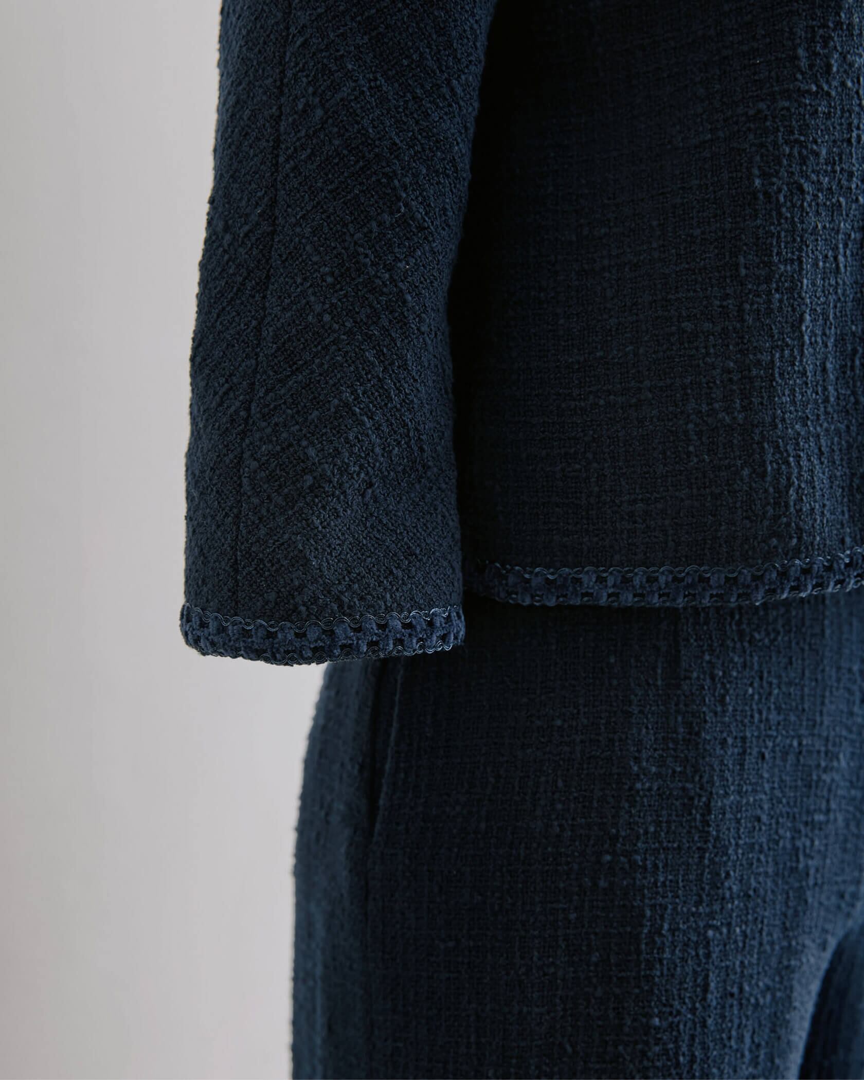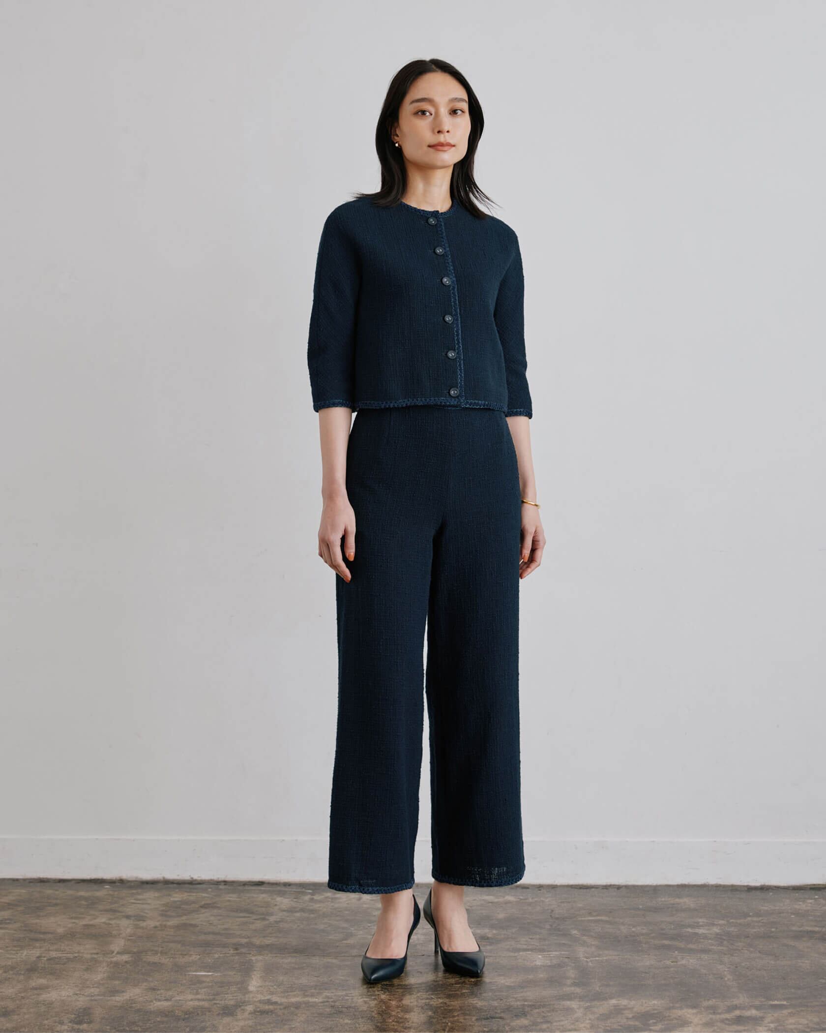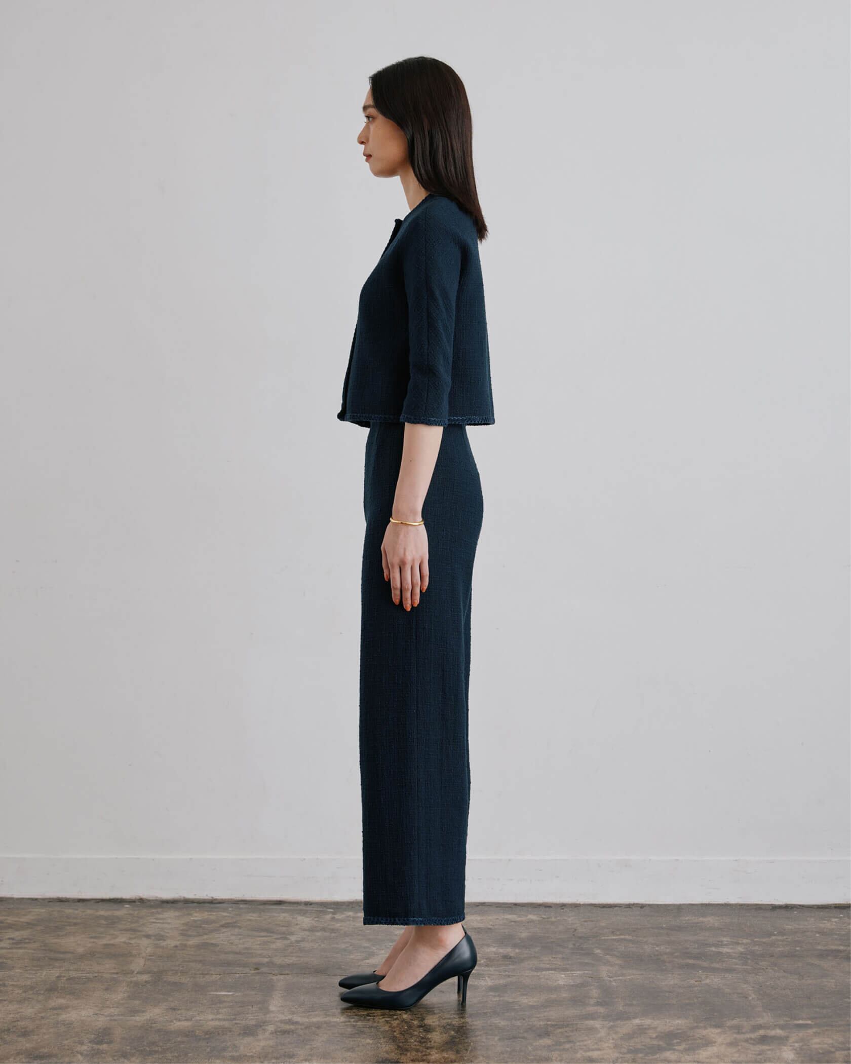 高級メゾンでも使用されるイギリスの老舗テキスタイルメーカー、リントン・フィード社のツイード地で仕立てたノーカラージャケット。衿ぐりや前立て、袖口、裾に和紙を編み込んだ美しいブレードをあしらい、華やぎをプラスしました。立体的な裁断によりラインはコンパクトに見えますが、その着心地はニットカーディガンのような快適さ。着丈を短めにすることで、全身バランスのポイントを上げて脚長に。七分袖にして手首を見せることで、腕を長く見せつつ軽やかさを演出しています。Tシャツとデニムといういつものスタイルに一枚重ねるだけで、大人のデイリースタイルが格上げされます。同じ素材のボトムもご用意したので、セットアップで持てば仕事や家族の行事など、改まったシーンの時に本当に頼りになります。生地の色に合わせて染めてもらったボタンをアクセントに。