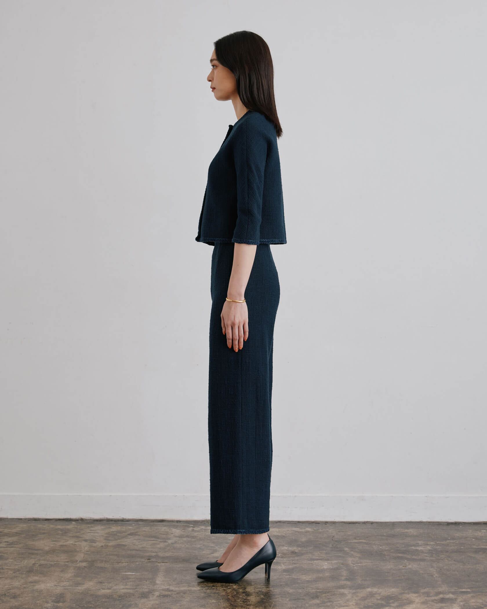 高級メゾンでも使用される英国のリントン・ツィード社の生地を使った脚長効果が狙えるワイドパンツ。奥行き感のあるネイビーの生地に、同色の華やかなブレードをウエストと裾に配し、パンツですが女性らしさが引き立つデザインです。裾に向かっての緩やかなAラインは、脚の線を自然にカバーしつつ、着る人のエレガントさを引き立てます。サイドファスナーでウエスト周りがすっきり見えるデザインなので、トップスをタックインにした様子もスマート。白シャツやボーダーTシャツとの、フレンチスタイルを意識した着こなしも素敵です。ジャケットとセットアップで持てば、活躍のシーンがぐっと広がります。両サイドにポケットあり。
