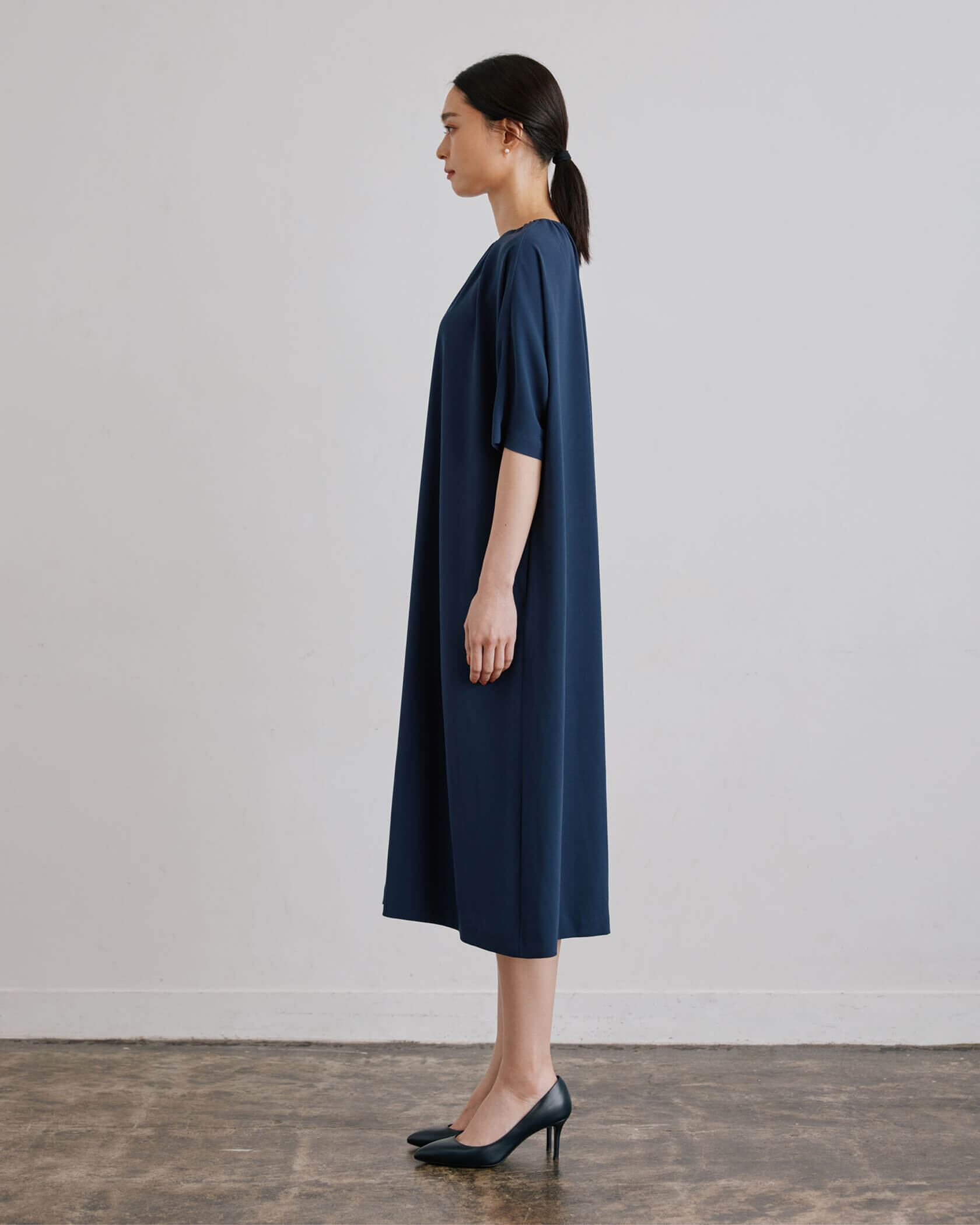 襟ぐりのギャザーが裾に向けてきれいなドレープを描くワンピース。布が立体的に浮き上がるギャザーにしたくて、手仕事で丁寧に仕上げてもらいました。ドルマンスリーブでアームラインも身頃もゆったりしていますがドレープが縦に入り、全体にスッキリした印象。抜け感を意識して袖丈をひじが隠れる五分袖にしたのもポイントです。程よい落ち感で広がりを抑えてくれるバックサテンジョーゼット地は、手洗いOKでシワになりにくい優秀素材。スニーカーと合わせてアクティブに、パンプスに合わせて清楚にと小物で印象がガラリと変わるので、旅のワードローブとしてもおすすめです。両サイドにポケットあり。